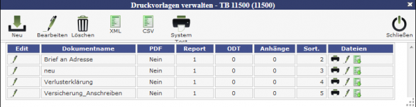 Über den Button <Bearbeiten> erfolgt die Bearbeitung der Druckvorlagen. Alle Druckvorlagen müssen geladen werden, damit diese zum jeweiligen Ausdruck zugeordnet werden kann. Das Laden der Vorlagen erfolgt über den Button <Bearbeiten> bei Ausdrucke.