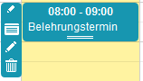 Durch Doppelklick auf den Termin öffnet sich die Terminmaske im Kalender und es können Änderungen vorgenommen werden. Wenn der Termin nur einmal angeklickt wird, erscheinen an der linken Seite Symbole, über die ebenfalls Änderungen vorgenommen werden können.