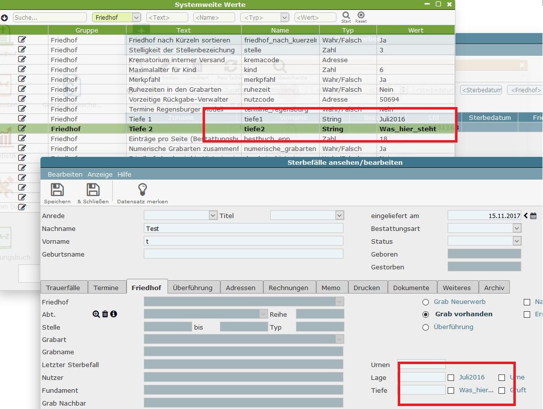 Dieser Tab ist für Informationen zum Grab und dessen Nutzer gedacht. Durch Klicken auf das Lupensymbol kann die im Friedhofsmodul gespeicherte Grabliste eingesehen werden. Mithilfe des Einkaufswagenicons kann dann ein Grab dem Sterbefall zugeordnet werden.