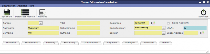 Die Eingabe der ersten Angaben muss gespeichert werden. Mit Hilfe der Lupe kann man schauen, ob es schon Einträge dazu gibt (z.B. ein Vorsorgefall). Nachdem die Angaben gespeichert wurden öffnet sich ein neues Fenster, in welchem die Angaben erweitert werden können. Dieses Fenster öffnet sich auch, wenn man einen bereits vorhandenen Trauerfall bearbeiten will. Es folgt das Fenster Trauerfall ansehen/bearbeiten.