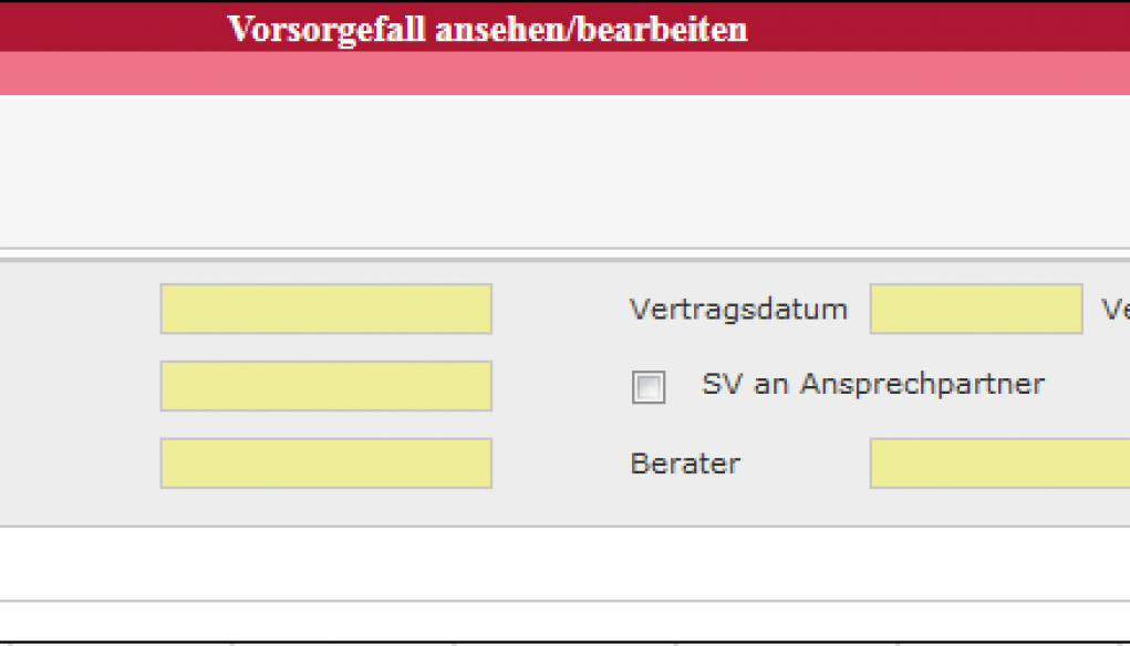 Nach dem Speichern der ersten Eingaben öffnet sich ein neues Fenster, in welchem die Angaben präzisiert werden. Um einen bereits vorhandenen Vorsorgefall zu bearbeiten muss er vorerst per Doppelklick ausgewählt werden. Es folgt das selbe Fenster „Vorsorgefall ansehen/bearbeiten“.